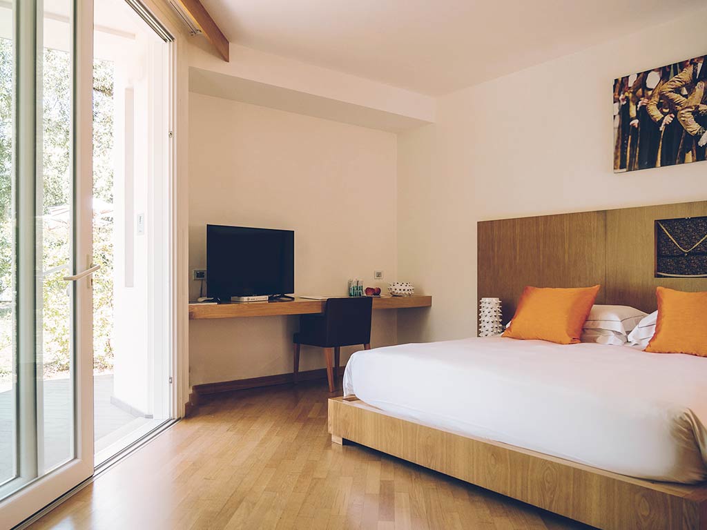 Begrüßungsgetränk und frisches Obst bei der Ankunft im Zimmer, Satellitenfernsehen mit SKY-Paket, kostenloses Internet, Telefon mit Direktwahl, Safe (Laptop-Größe), Minibar, individuell einstellbare Klimaanlage, zwei möblierte Veranden mit Liegestühlen, Stühlen und Tisch, zwei Badezimmer mit Dusche und Whirlpool, Hausschuhe, Bademäntel, Davines Höflichkeitsprodukte, Haartrockner, Doppelbett 180 x 200 x 30 und zwei Einzelbetten, Strand-Service (Sonnenschirm, Liegestühle, Strandtücher).